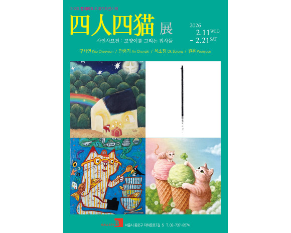 2026 갤러리B 기획초대전 '4인4묘전 - 고양이를 그리는 집사들' 전시일시 : 2026년 2월 11일(수) - 2월 21일(토) 11시 - 18시 (2월 17일 설날 휴관) 작가와의 만남 : 2026년 2월 14일(토) 오후 3시 전시작가 : 구채연, 안충기, 옥소정, 원윤 전시장소 : 갤러리B (서울 종로구 자하문로7길 5) *특별